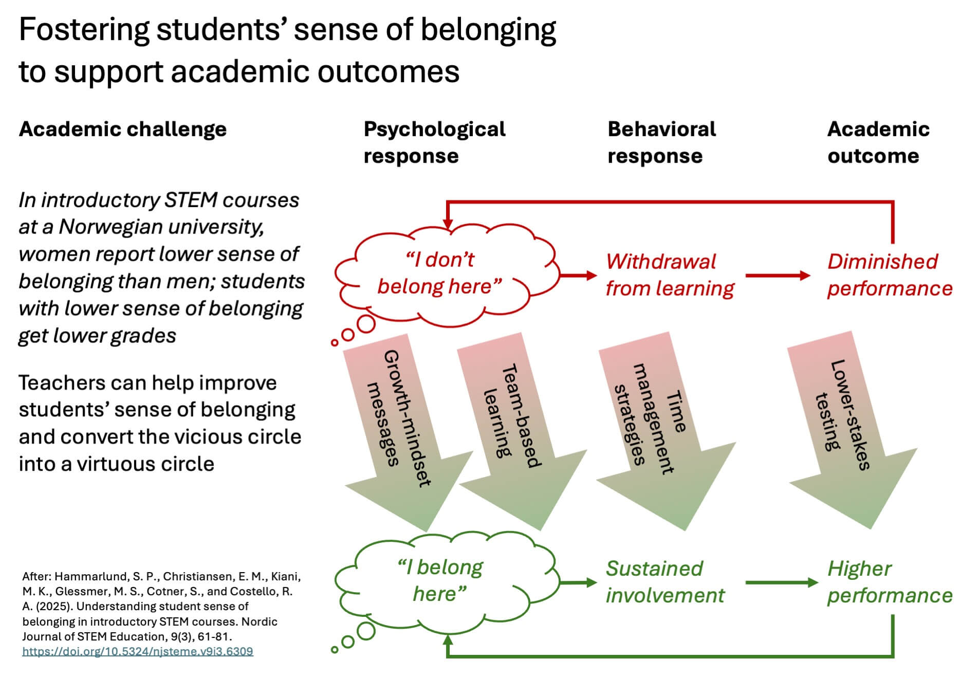In this article, we investigate sense of belonging of students in STEM courses at the University of Bergen, Norway. We find — as expected from studies in mostly a US context, but for the first time investigated in a Scandinavian culture with generally high gender equality — that women report significantly lower sense of belonging than men, and that students with lower sense of belonging generally have lower grades. As shown in the featured image, this can lead into a vicious circle.