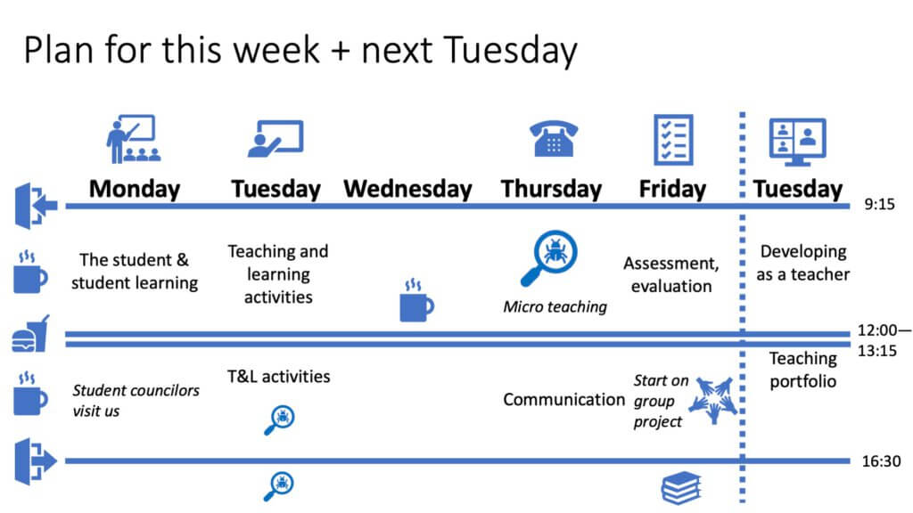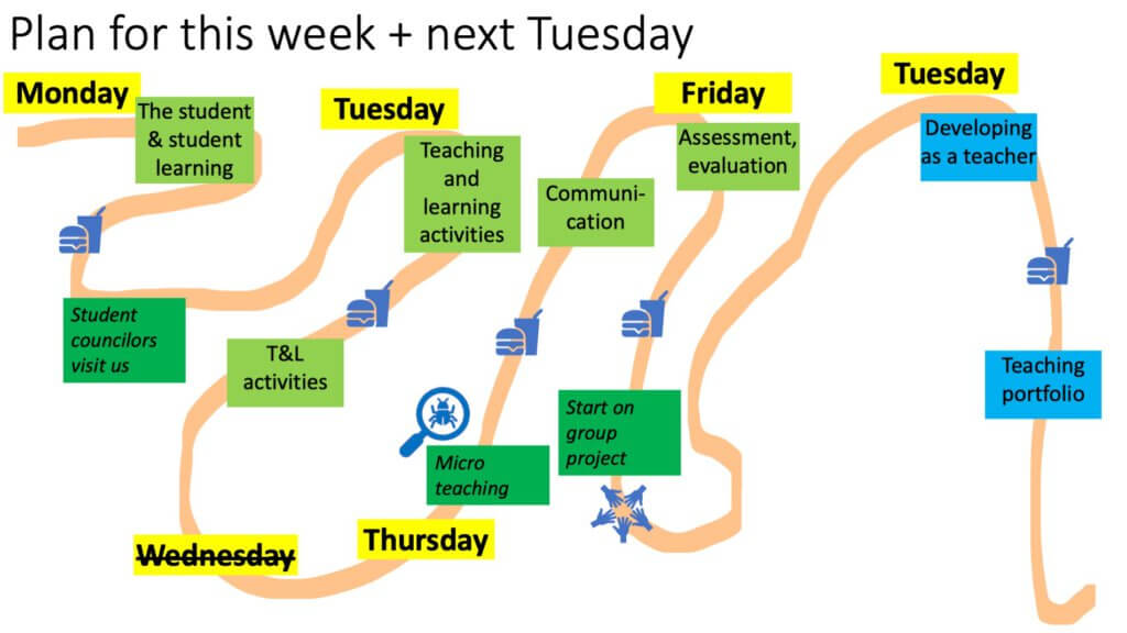 - “Hiking trail” is a graphical organiser / roadmap of the seminar. Always recommended to have! In this case, it is the picture of a trail on which sticky notes of different colours mark dates and times, main topics, and maybe different methods, theory or practice, compulsory or voluntary. At first, I thought that idea was a bit silly and what’s wrong with my normal table overview, but the more I think about it, the more I like it — especially in an in-person course where it can stay up on the wall / whiteboard over several days, be revisited, be modified, and also just serve as decoration to the room. Will definitely try! Below are a typical table that I use (pro: I can easily tell people the exact times I want to start and finish (very important for me), and it looks clean and easy to read) and a quick and dirty mock-up of the path (needs to be squiggly to fit in the same format. Pro: Looks a lot more lively! Con: Not as information-dense as a table, so not so easy to have the exact times given everywhere. Also not as easy to convey that Wednesday is just a fika day, and that there is a break between Friday and Tuesday). And I definitely understand why the authors recommend to sketch out the path first before committing to it on a large canvas — it requires some planning! I think it really works better on a larger area. Also, missed opportunity in my path to show where we circle back to topics — that could very easily be implemented! Anyway, like this idea a lot! (Plus, it could easily include the “parking lot” for questions and comments that we want to revisit later!)