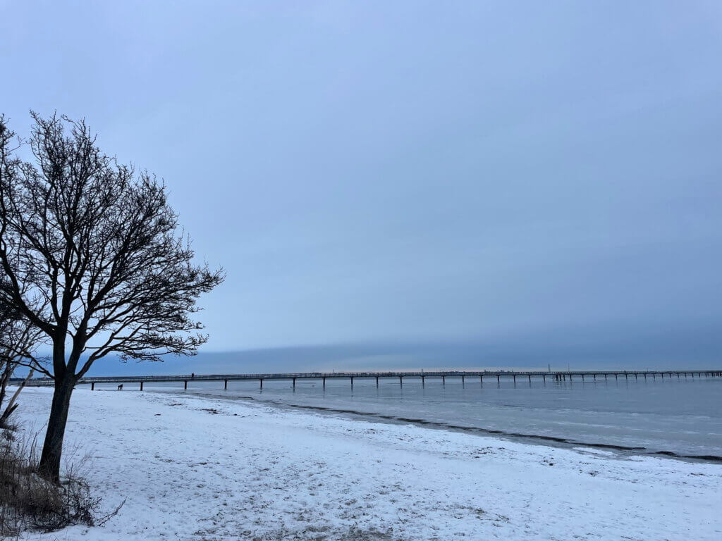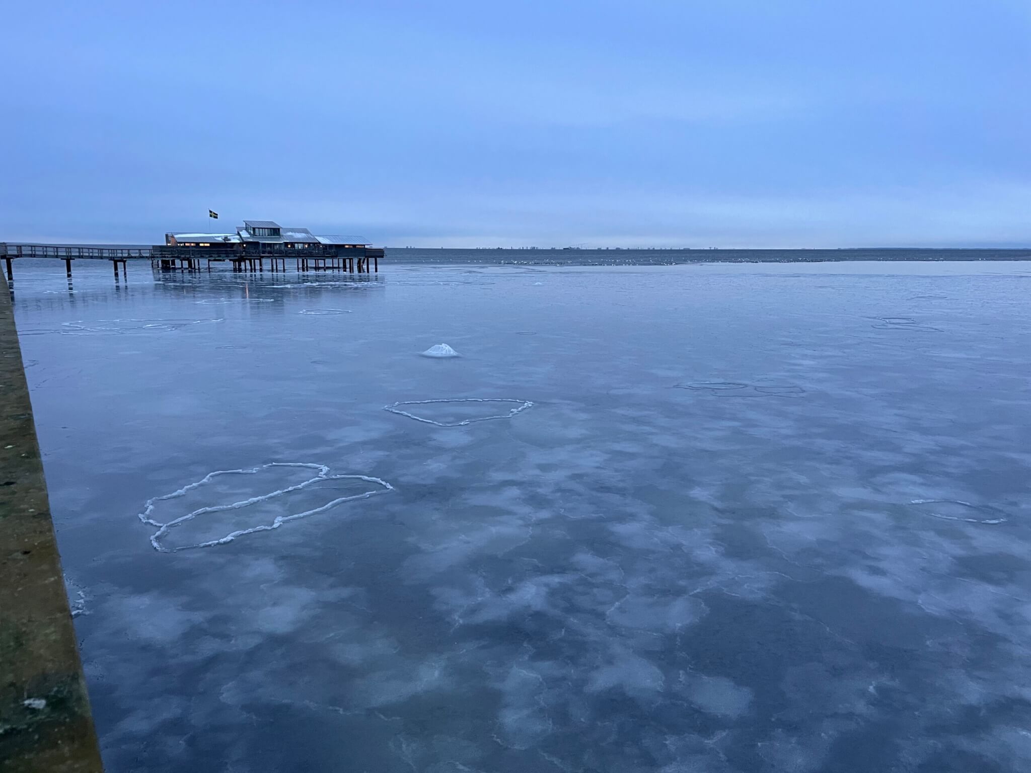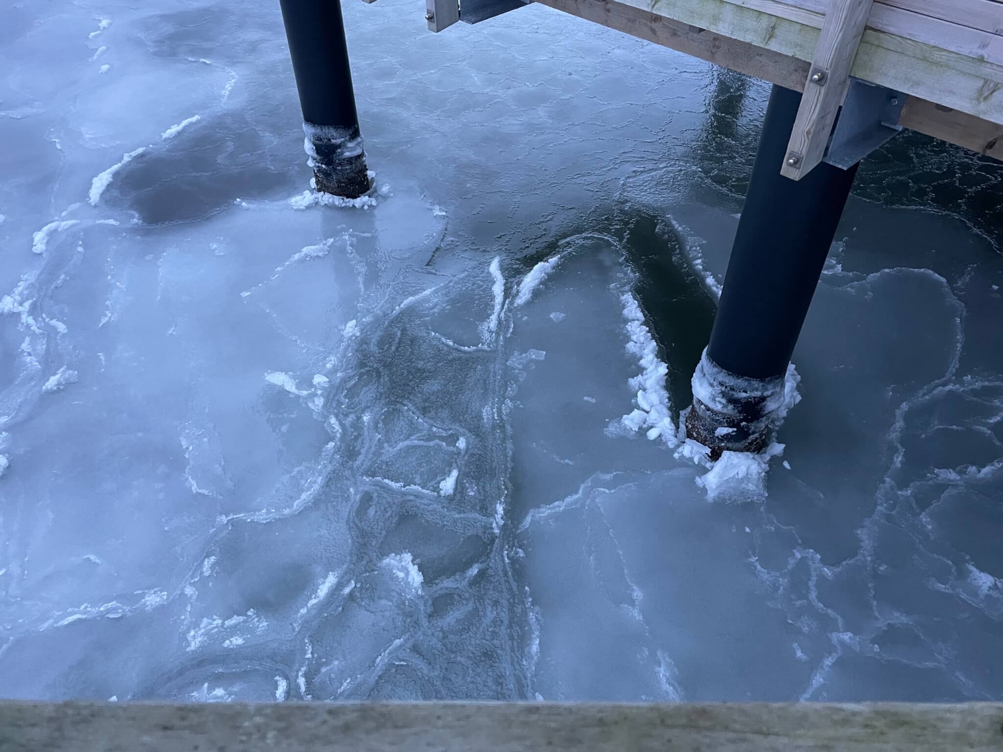 Now that I had noticed it out on the platform, I could see it almost all the way back to the beach! Here the sheet has been drifting left to right, as you can see from the long stretches of broken ice starting at each pillar and going out to the right