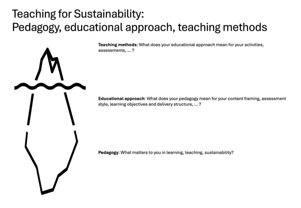 One way to do that might be using something like the handout below. The idea is inspired by Sandri (2022), who explains how pedagogy, educational approach and teaching methods are connected in an iceberg, where only the teaching methods are ultimately visible, but are carried by this whole other stuff from beneath. So what if the portfolio was structured around that handout (which they would work on in the “through” module first, bottom-up), to start out describing the lens they use to look at teaching and learning (the pedagogy), what that means for their educational approach, how that is reflected in the teaching methods, and then ultimately give examples of activities and content they developed in the MOOC? That would definitely something that I would enjoy writing and reading!