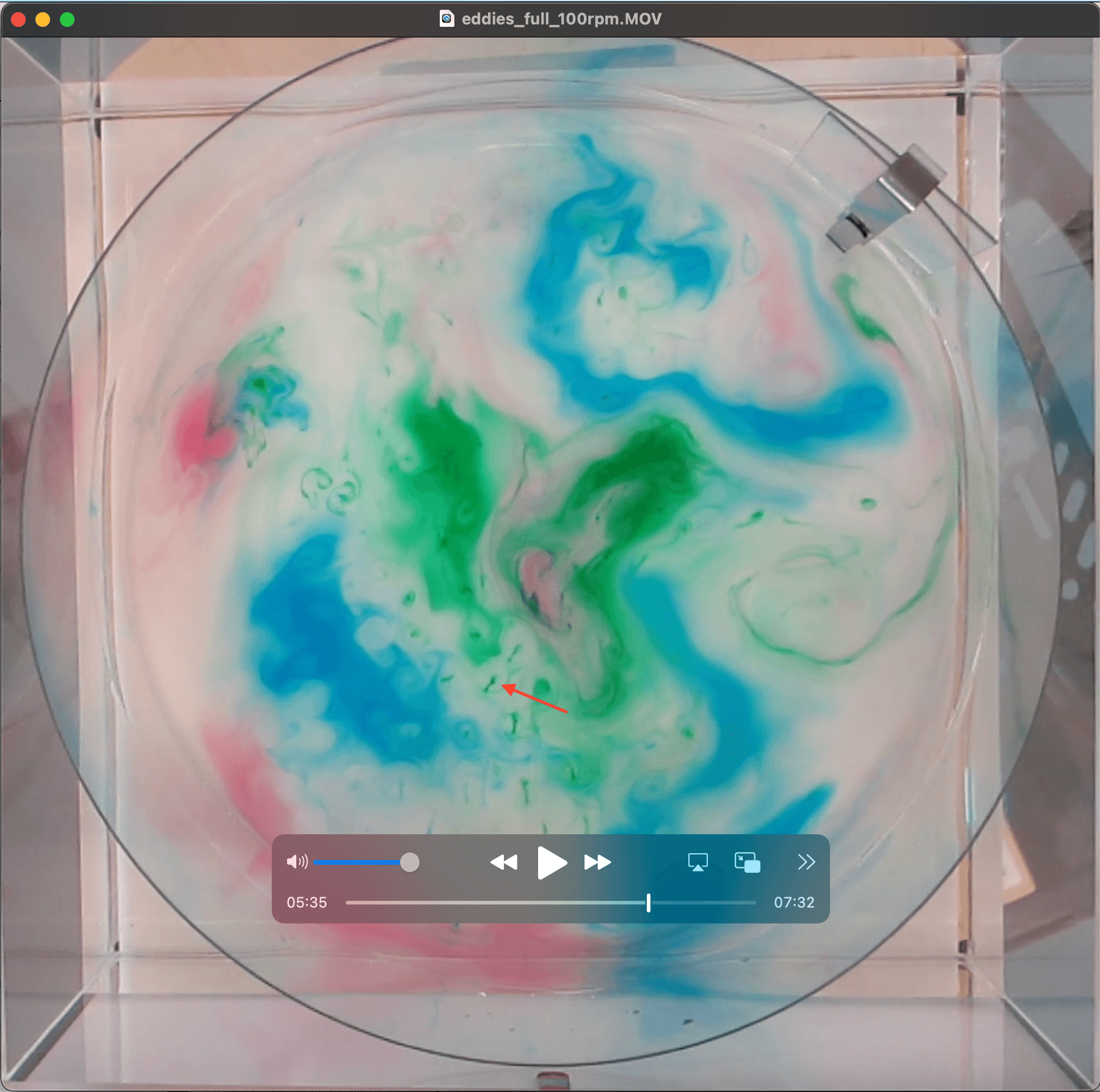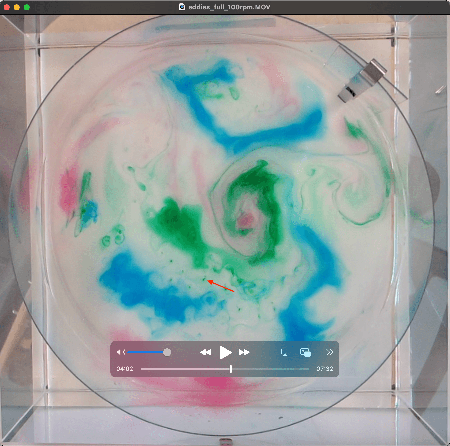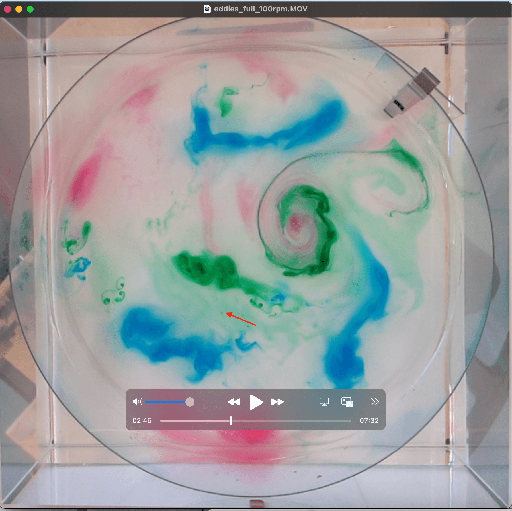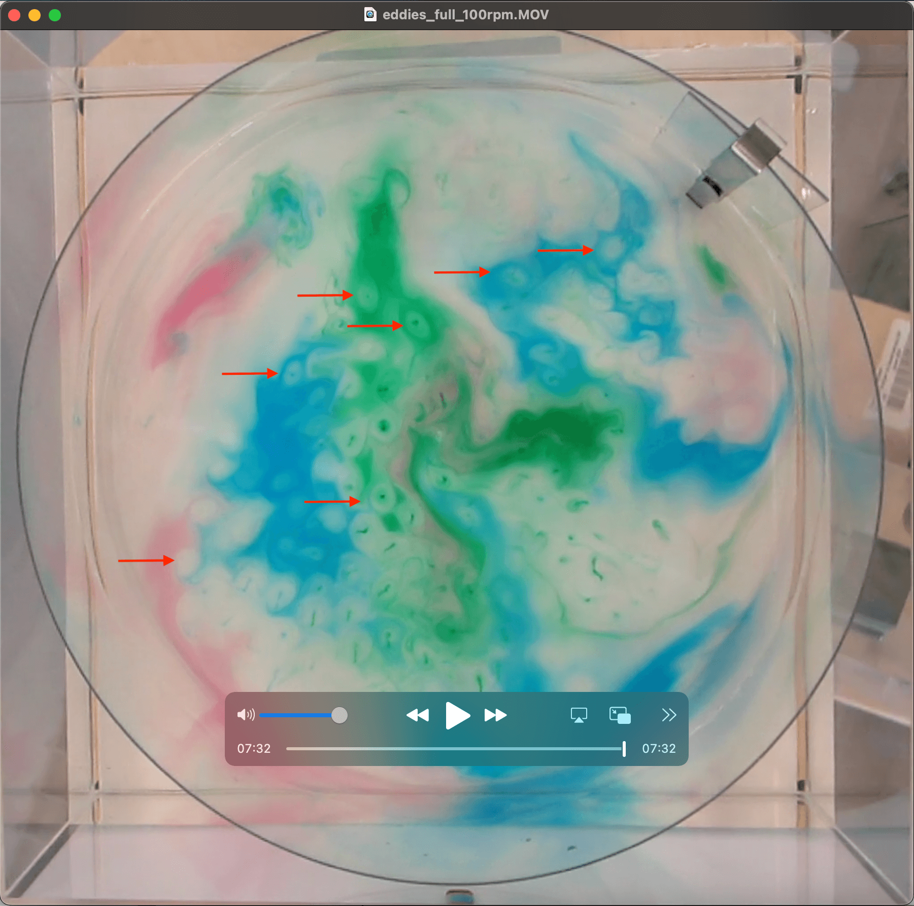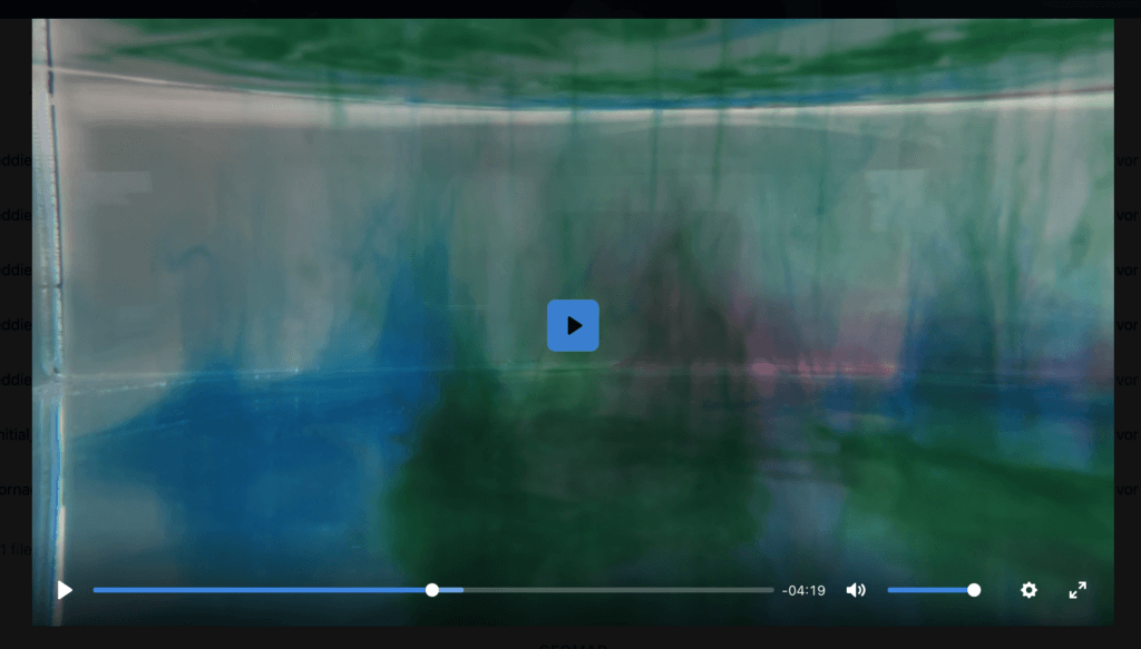 But let’s look at the tank in side view to get an idea where the dye is located in the water column. We see that most of the dye sits either in the rotating columns or at the bottom (and don’t be fooled by the reflection in the surface, that looks like a lot more dye up there than it is, I am speaking from experience…). But there is some dye in the surface, possibly even a dye film? In any case, watching the movie, we see that the dye threads grow downwards from the top, so there must have been some up there (and Jim confirmed the dye film theory in a comment on a draft of this post. Good!).