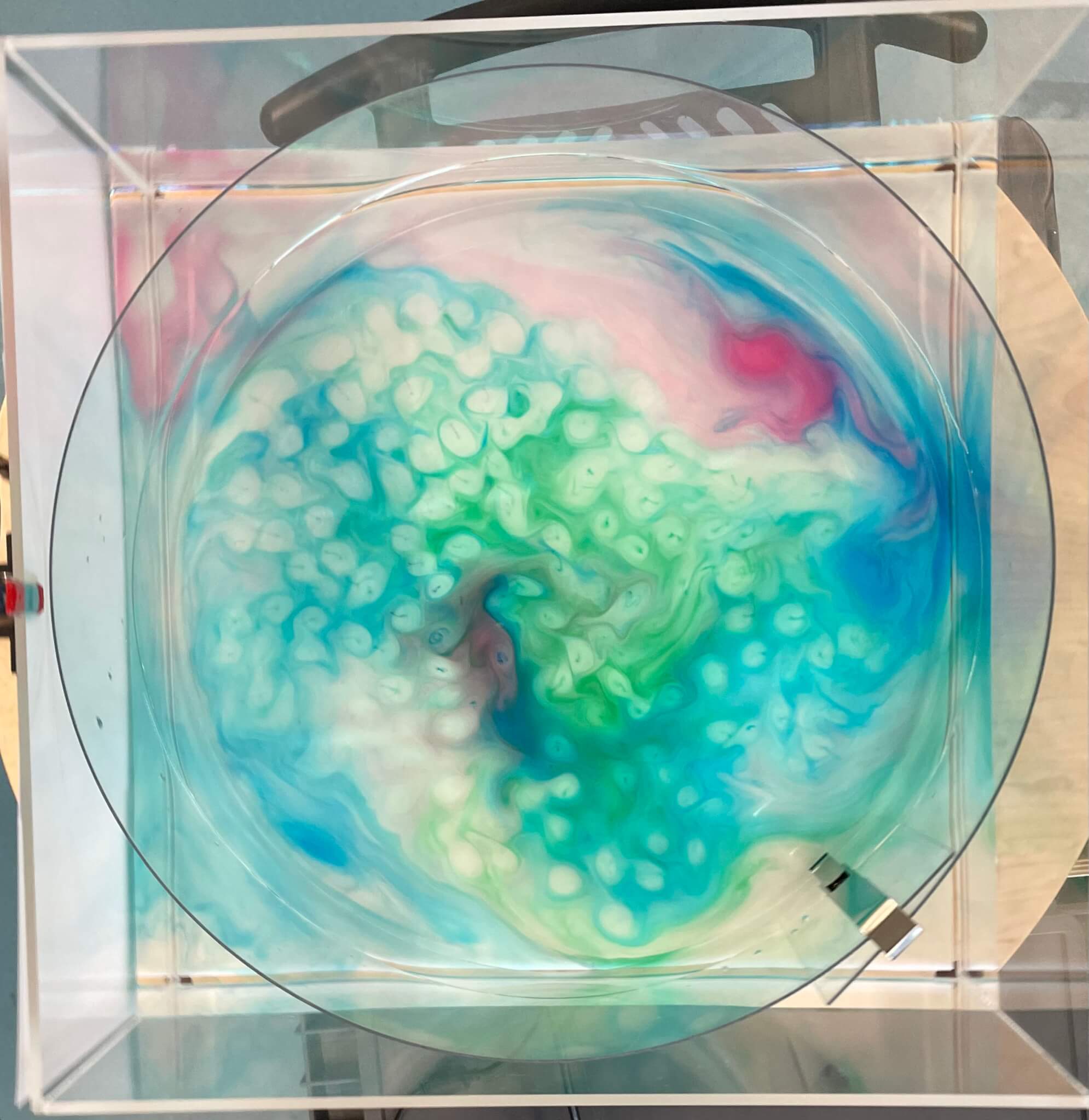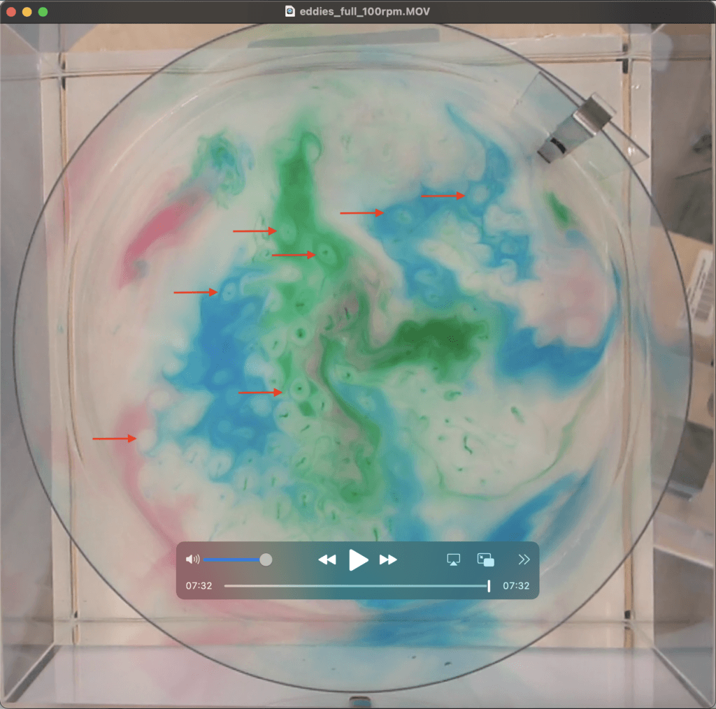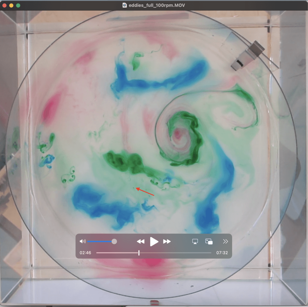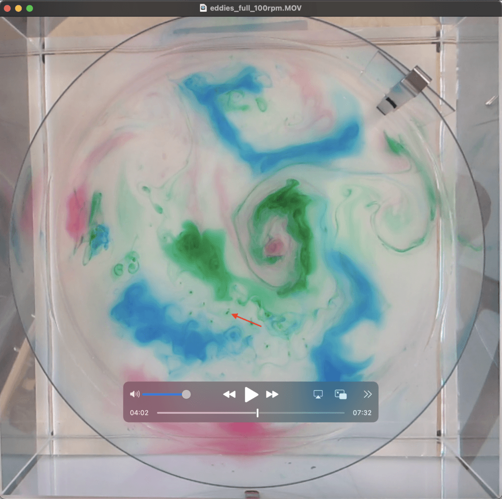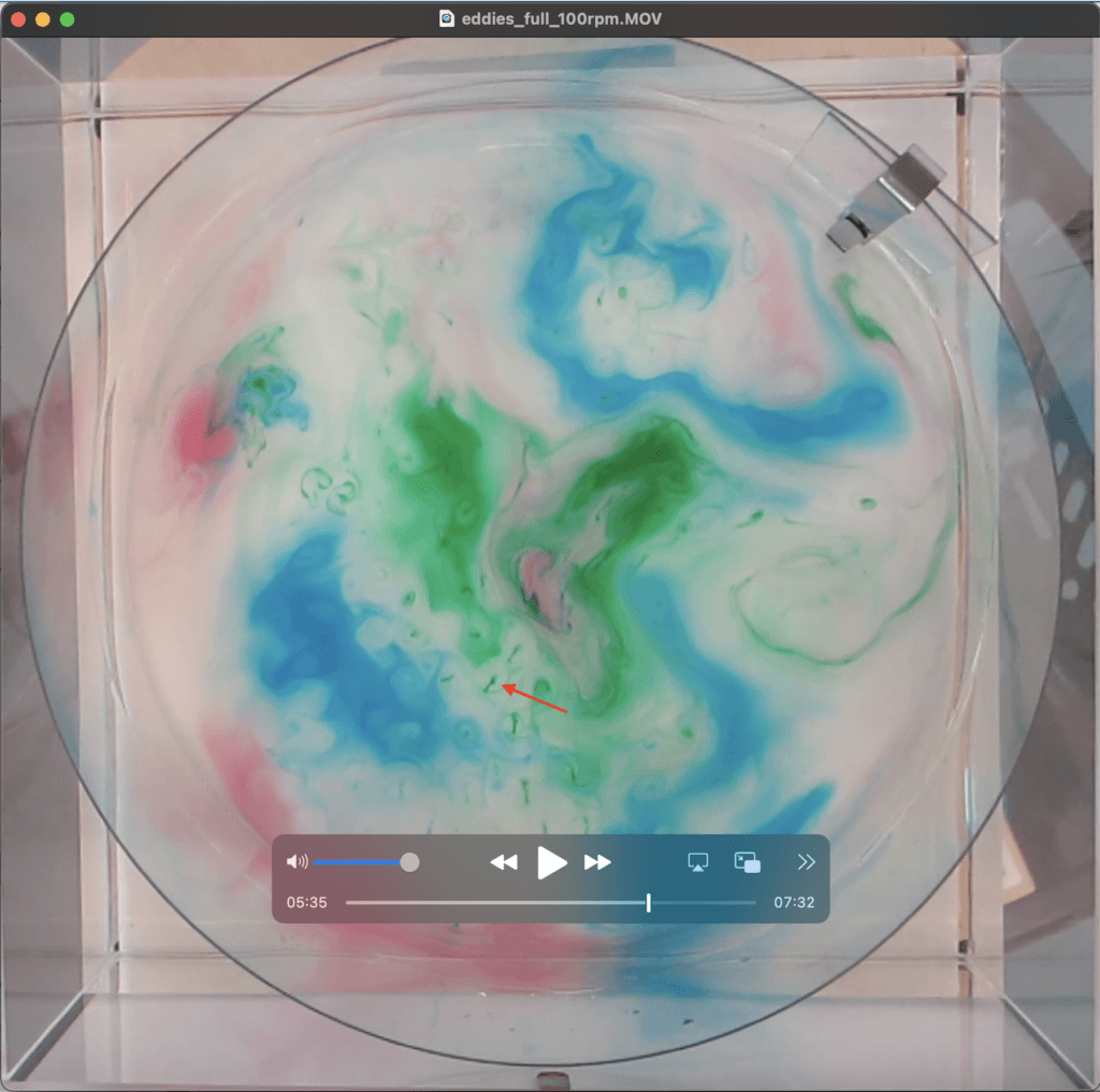 Torge and his intern Jim Sohr set up a rotating tank (cold water, cold room), stirred a bit, and added dye to observe Taylor curtains and how turbulence in a rotating tank is 2D (similarly to what we did here). But then after 10ish minutes, mini “tornados” form with a rotating dye thread in the middle (just a dye dot as seen from above) and a clear, circular area around them. What is happening?