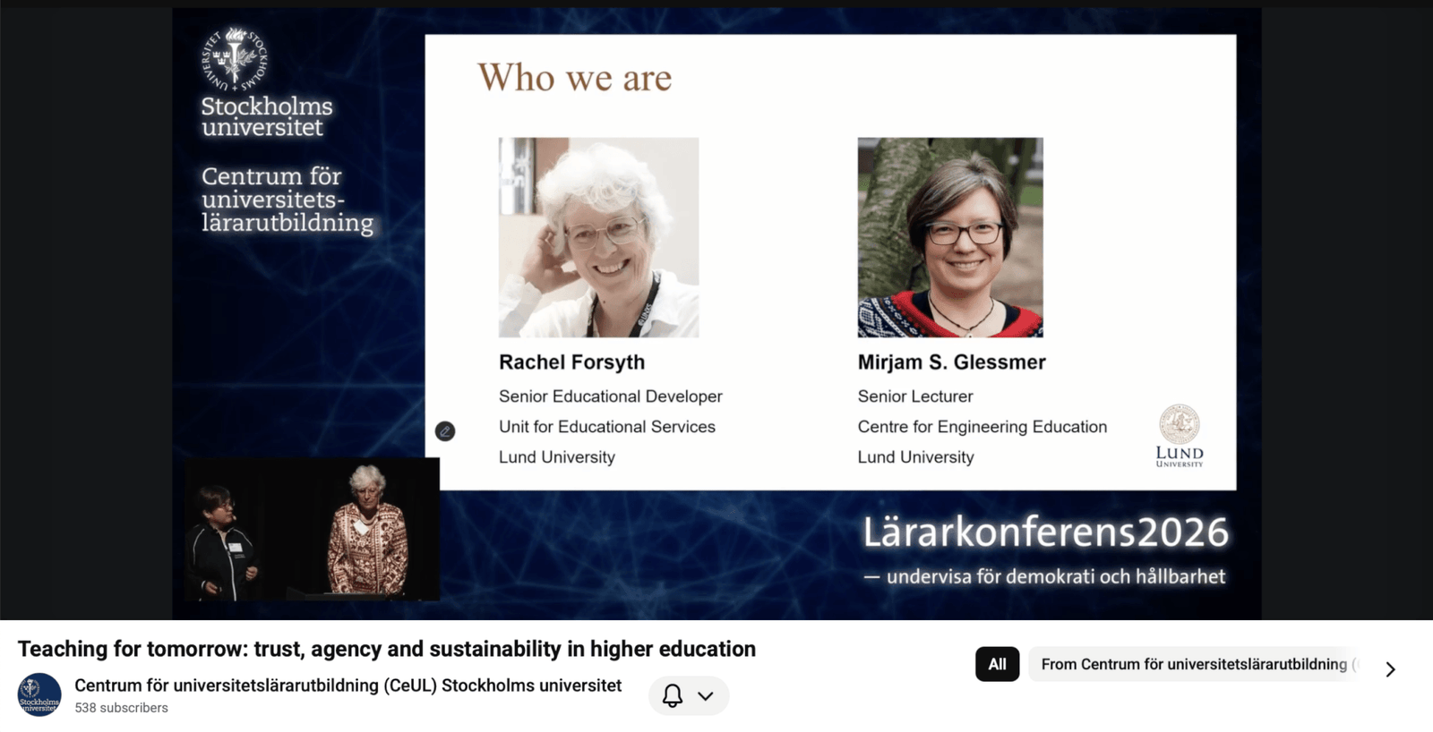 In March, Rachel Forsyth and I were invited to give the keynote at Stockholm University’s teacher conference 2026. The conference theme was “teaching for democracy and sustainability”, and about a year before the conference, we ambitiously announced we would be talking about “Teaching for tomorrow — trust, agency and sustainability in higher education”. Now the recording of what we had to say on that topic is available on youtube! Link here and video embedded below if you are curious.